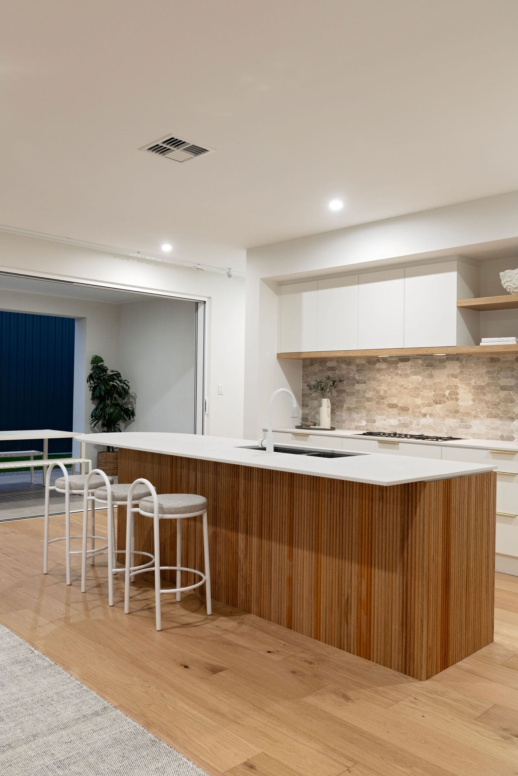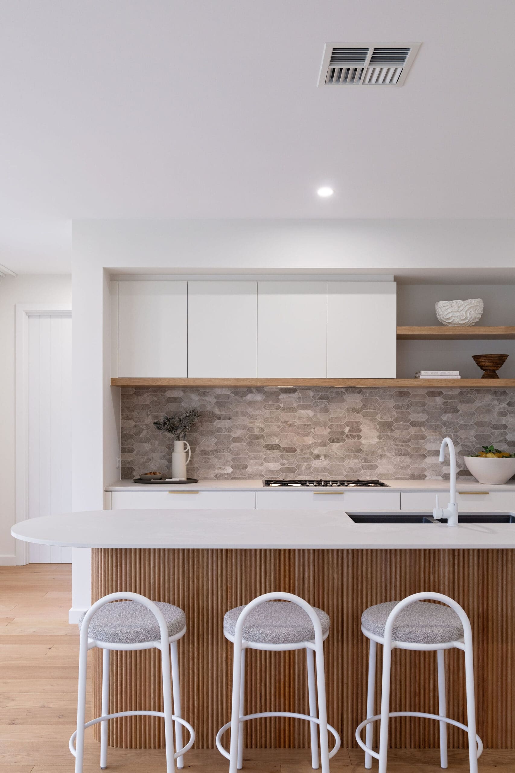 The unique rounded island bench, clad in porta timber, becomes a natural focal point, inviting conversation and shared meals. Soft hues adorn the walls, creating a calming atmosphere that makes this home a true oasis of comfort. This light and timber masterpiece is the perfect place to unwind and connect with loved ones