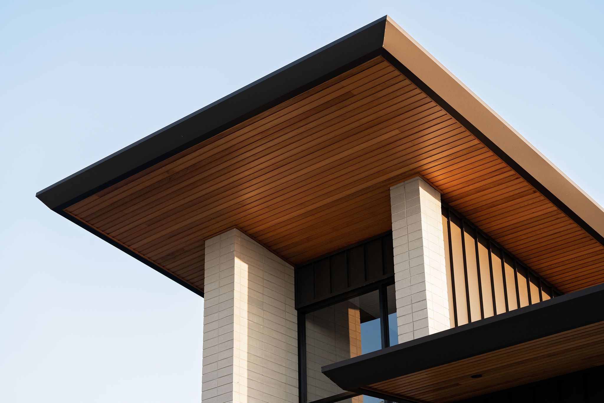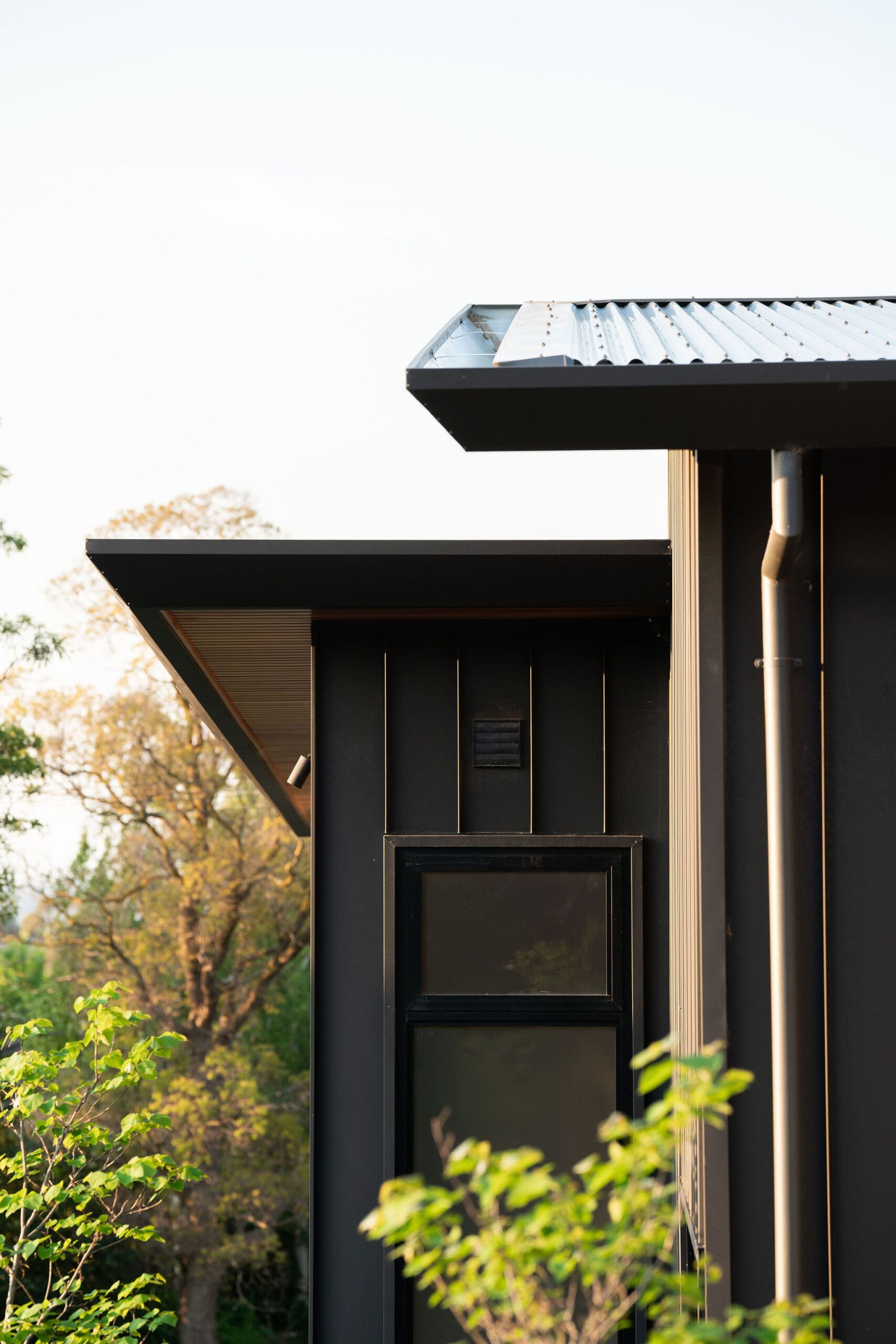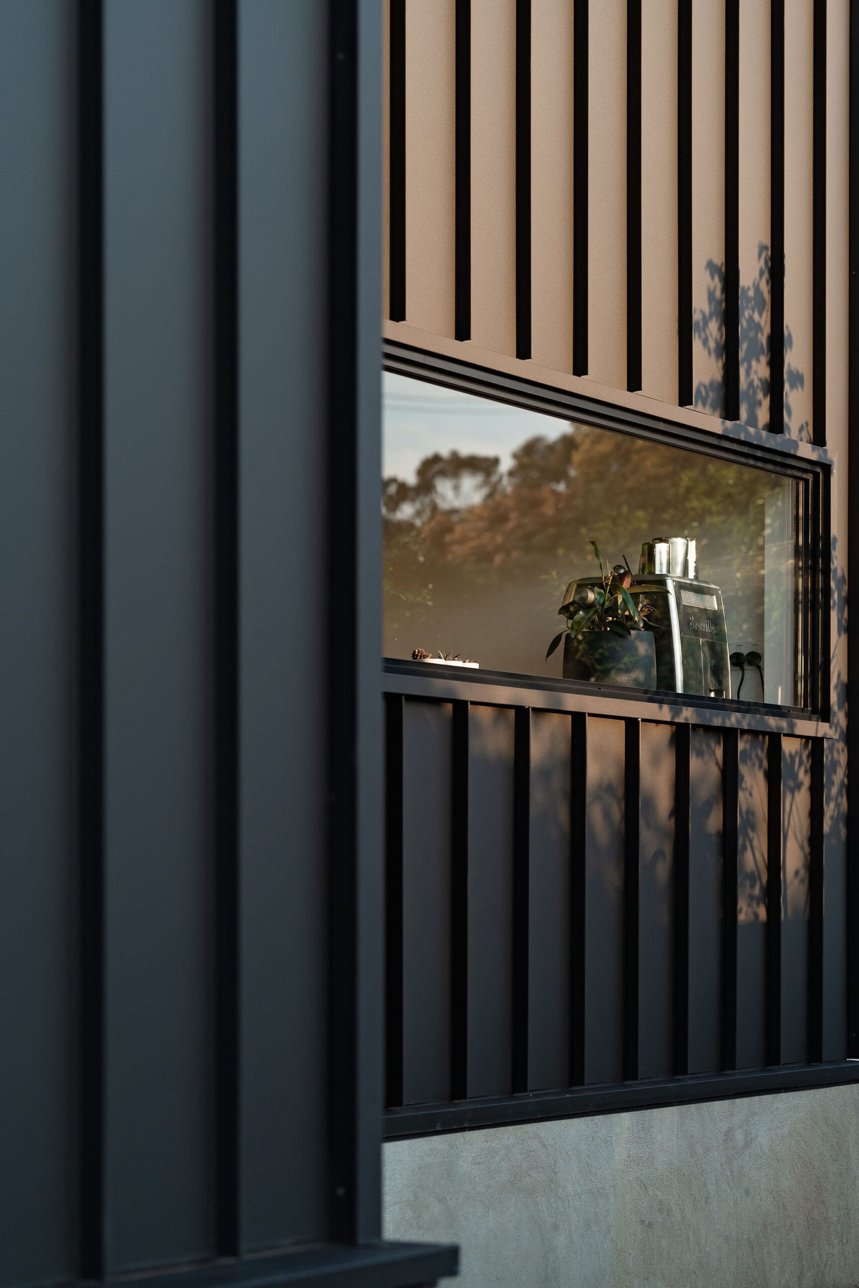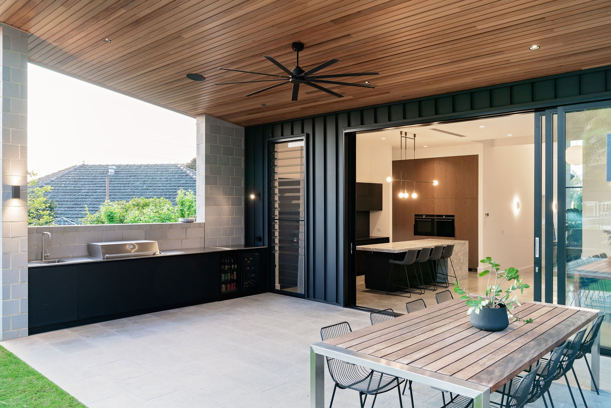 Externally, the home boasts striking Western Red Cedar eaves, matte black Colourbond cladding, honed concrete blockwork, commercial windows and doors, and a dramatic 6m high entry.